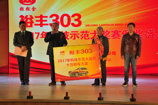 現(xiàn)場針對2017年221名裕豐303優(yōu)秀種植示范戶分別頒發(fā)十萬轎車、金磚、電動三輪車獎品,以表彰他們科學(xué)種田、示范推廣優(yōu)良品種裕豐303所作出的突出貢獻(xiàn)。其中一等大獎價值十萬元的轎車被安徽蕭縣酒店鎮(zhèn)胡孝蘭摘得,其中參賽產(chǎn)量為2252.9斤;二等獎價值5000元的金磚分別被河南省西華縣、滑縣、山東省梁山縣、陽信縣、河北省臨漳縣、任丘市、安徽利辛縣、泗縣、江蘇灌云到等20個縣市示范戶獲得,其中山東省平度市張舍鎮(zhèn)石賢勝畝產(chǎn)達(dá)2108斤、滕州市張汪鎮(zhèn)張佑代畝產(chǎn)達(dá)2025.36斤、河北省灤平縣大屯鄉(xiāng)王國強(qiáng)畝產(chǎn)達(dá)2040.28斤;二等獎20名平均畝產(chǎn)達(dá)1800以上。